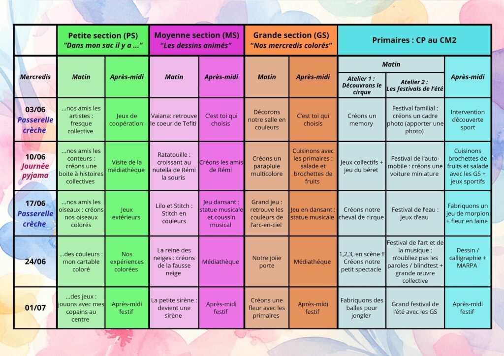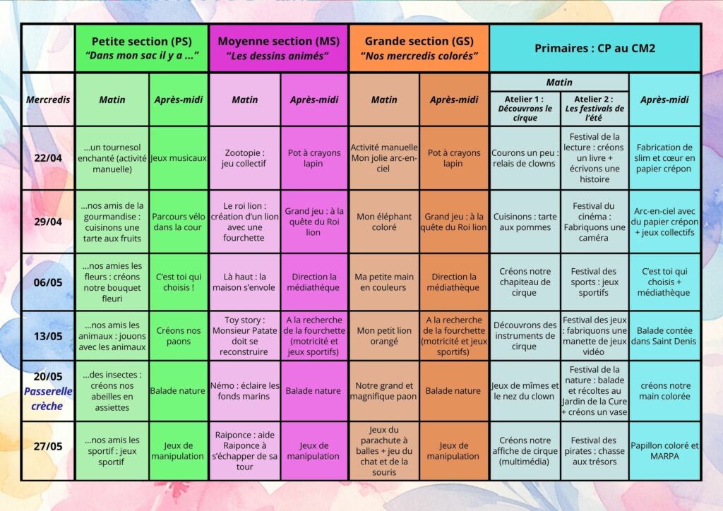 Programme des mercredis au centre de loisirs d’avril à juillet
